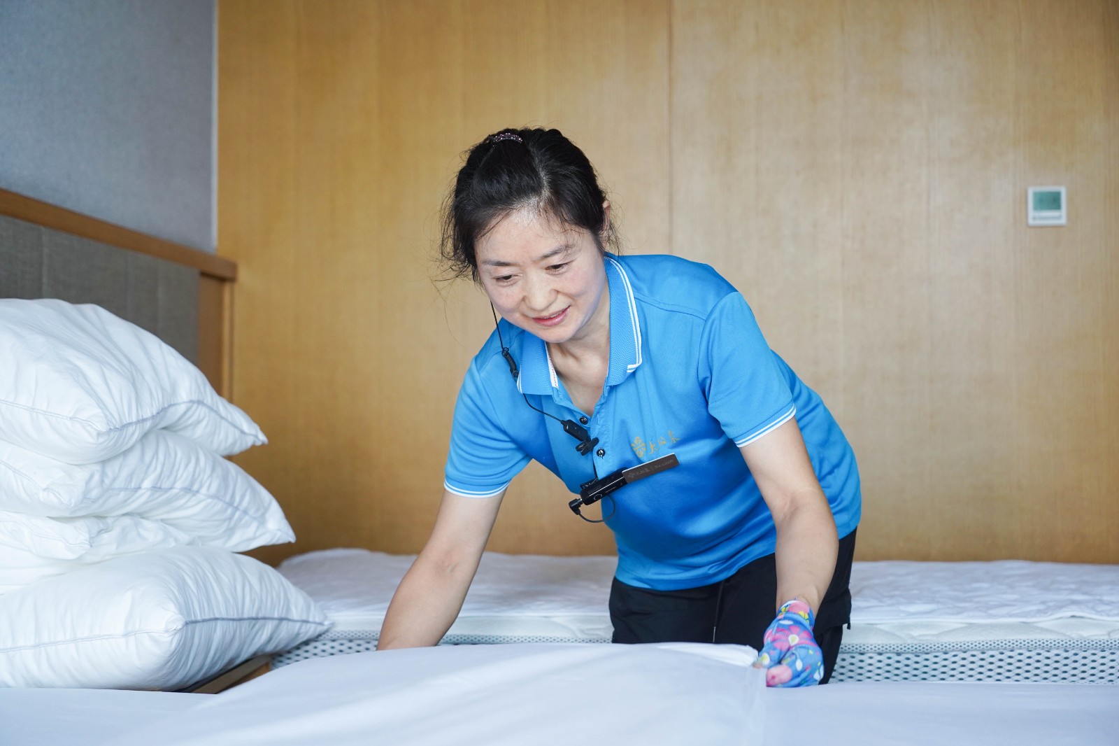 其实在入住高峰的时候,大家的工作量和工作任务都会增加。面对催促,我觉得主动沟通是关键。其实多数客人都很通情达理,我们需要及时告知进度并表示会保证做房质量,客人一般都愿意等待,甚至会说“不着急,做好就行”。当客人理解我们的时候,我会感到一丝暖意。我们理解客人等待的心情,内心同样着急,但越是这种时候,越要沉着细心,方能兼顾效率与品质。