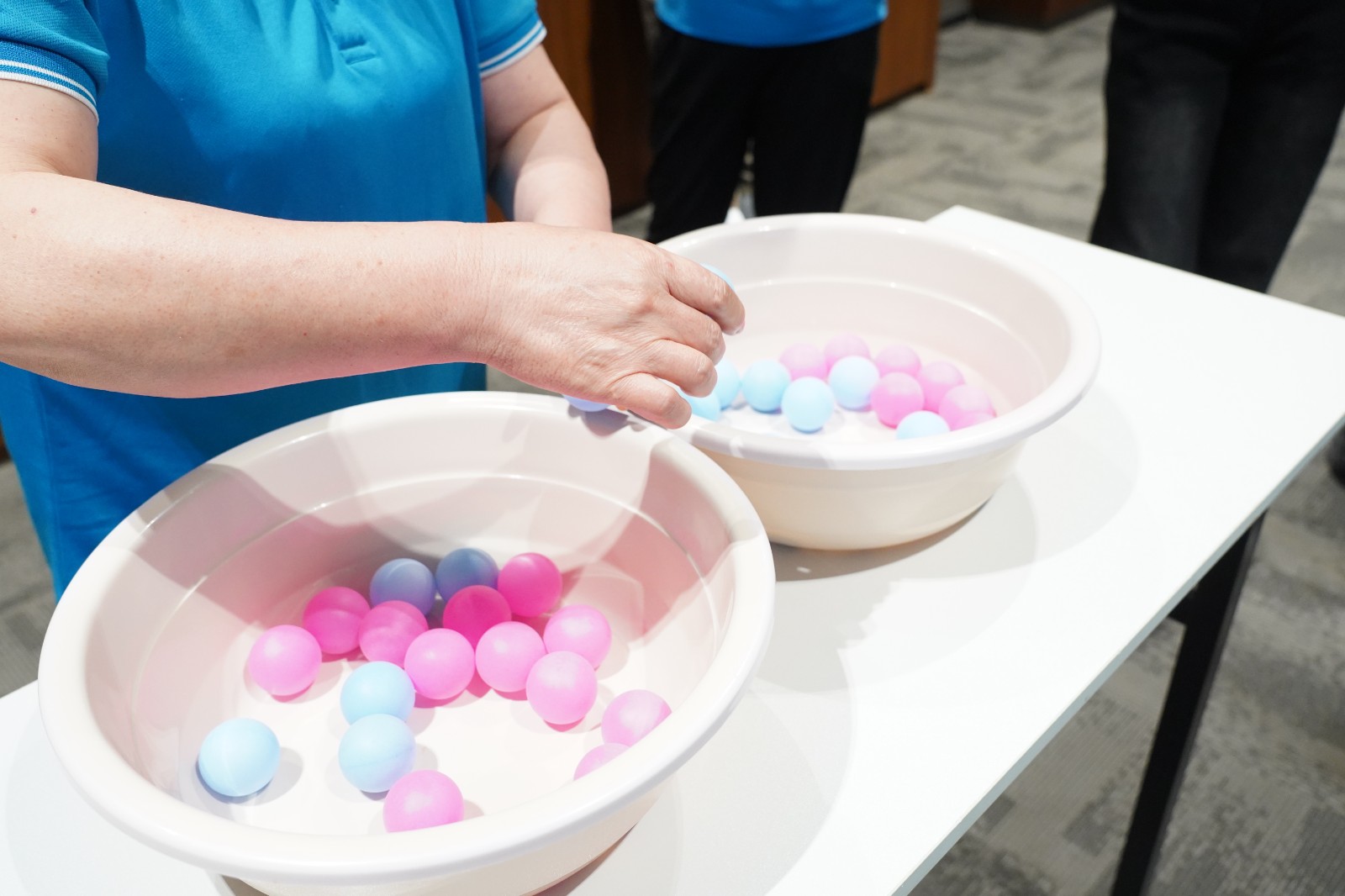 随着主持人的一声令下,首轮游戏瞬间点燃全场。参赛者双手各握一球,目光紧盯着盆中的粉色与蓝色,手指如闪电般快速交替,将球按照指令完成交换。球影翻飞间,只听见“啪啪”的落盆声与队友的加油声交织在一起。有人动作行云流水,引得阵阵喝彩;有人一时慌乱,被罚加时10秒,急得队友直跺脚却又忍不住笑作一团。