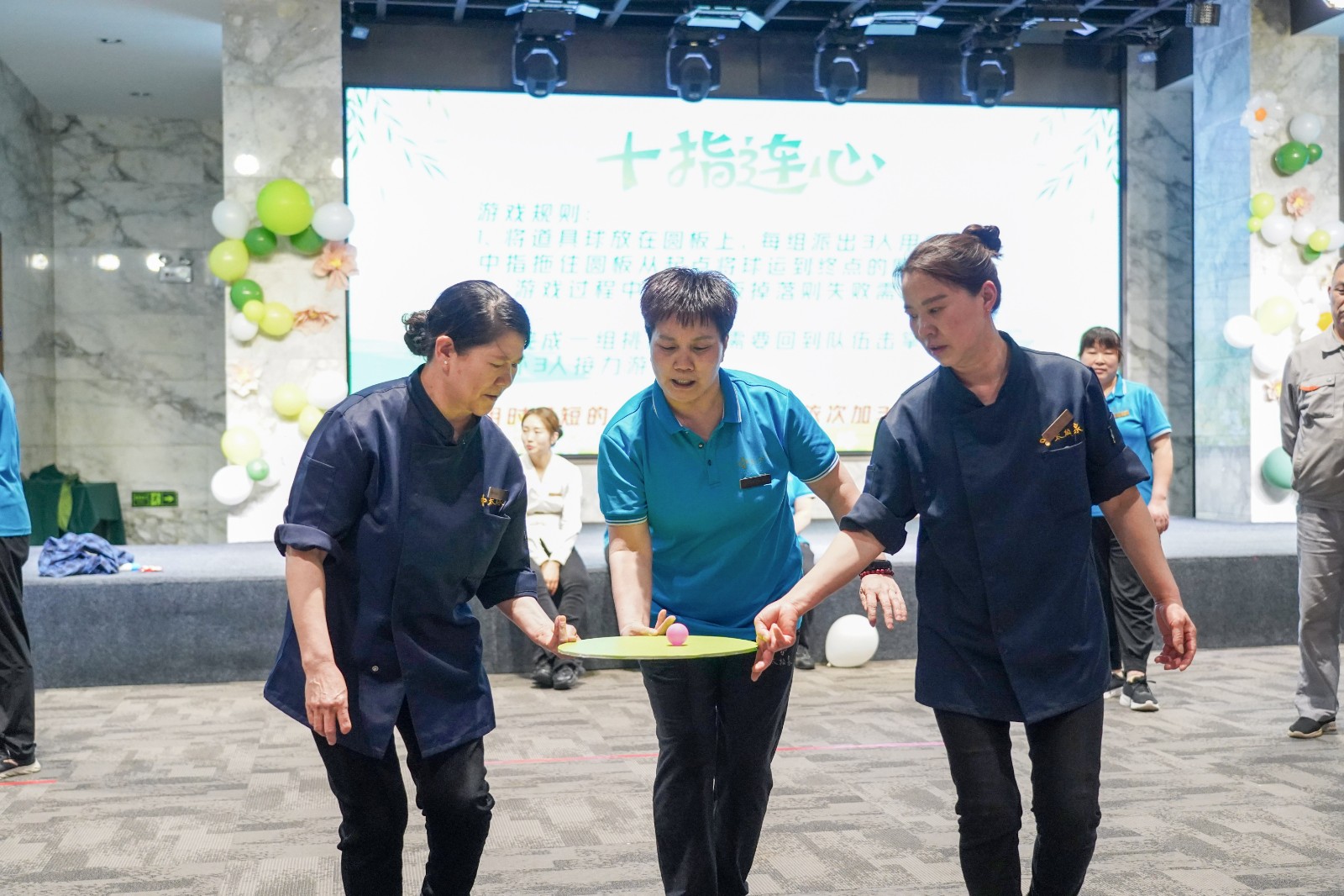 最后一轮游戏,将比赛的节奏从激烈转向细腻。每组三名队员并肩而立,用食指和中指轻轻托住圆板,圆板上稳稳安放着一颗小球。大家屏住呼吸,迈着细碎如猫步的步伐,小心翼翼地向前移动。圆板微微晃动,小球随之轻轻滚动,所有人的目光都紧紧锁定在那颗小球上,生怕它掉落。“稳住!稳住!”队友们互相轻声提醒,空气中弥漫着紧张而又温暖的气息。成功将球送入圆筒的瞬间,队员们击掌相庆,欢呼声洋溢全场;若球不慎掉落,大家也毫不气馁,迅速返回起点,重整旗鼓再出发。每一次成功,都伴随着热烈的掌声与由衷的喜悦。